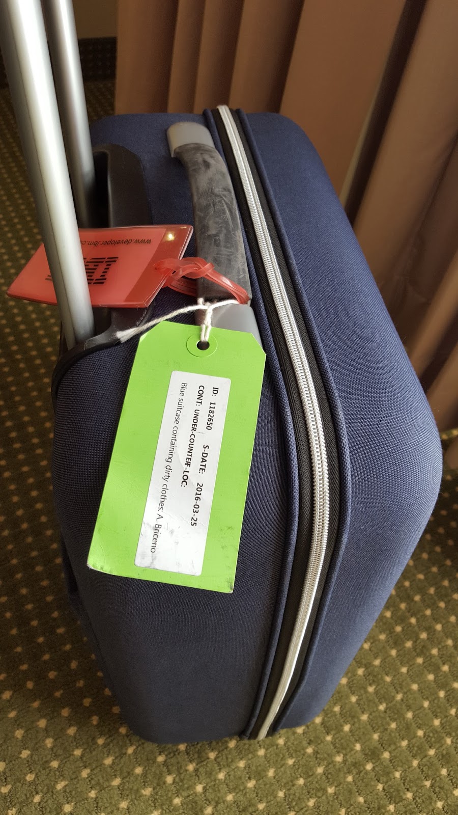 I love the tag they put on my luggage when I left it at the San Diego airport. It reads “Blue suitcase containing dirty clothes.”