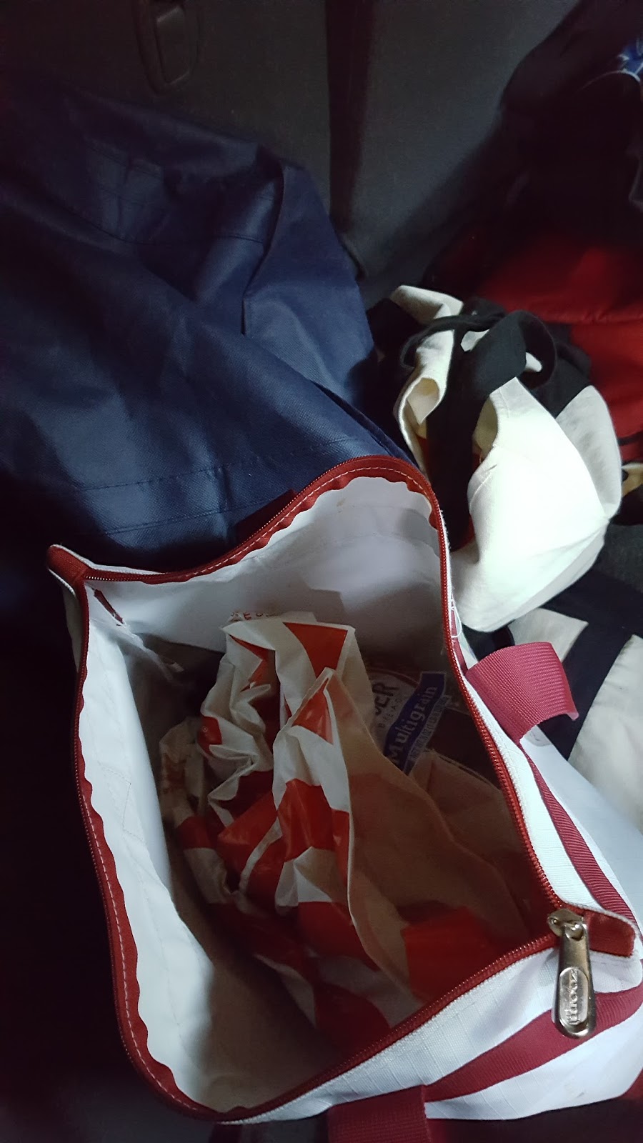 When I woke up this morning I had an aha moment: the bread might still be in the car. I did a more thorough search and yes, lo and behold there was one more bag of food in the car.