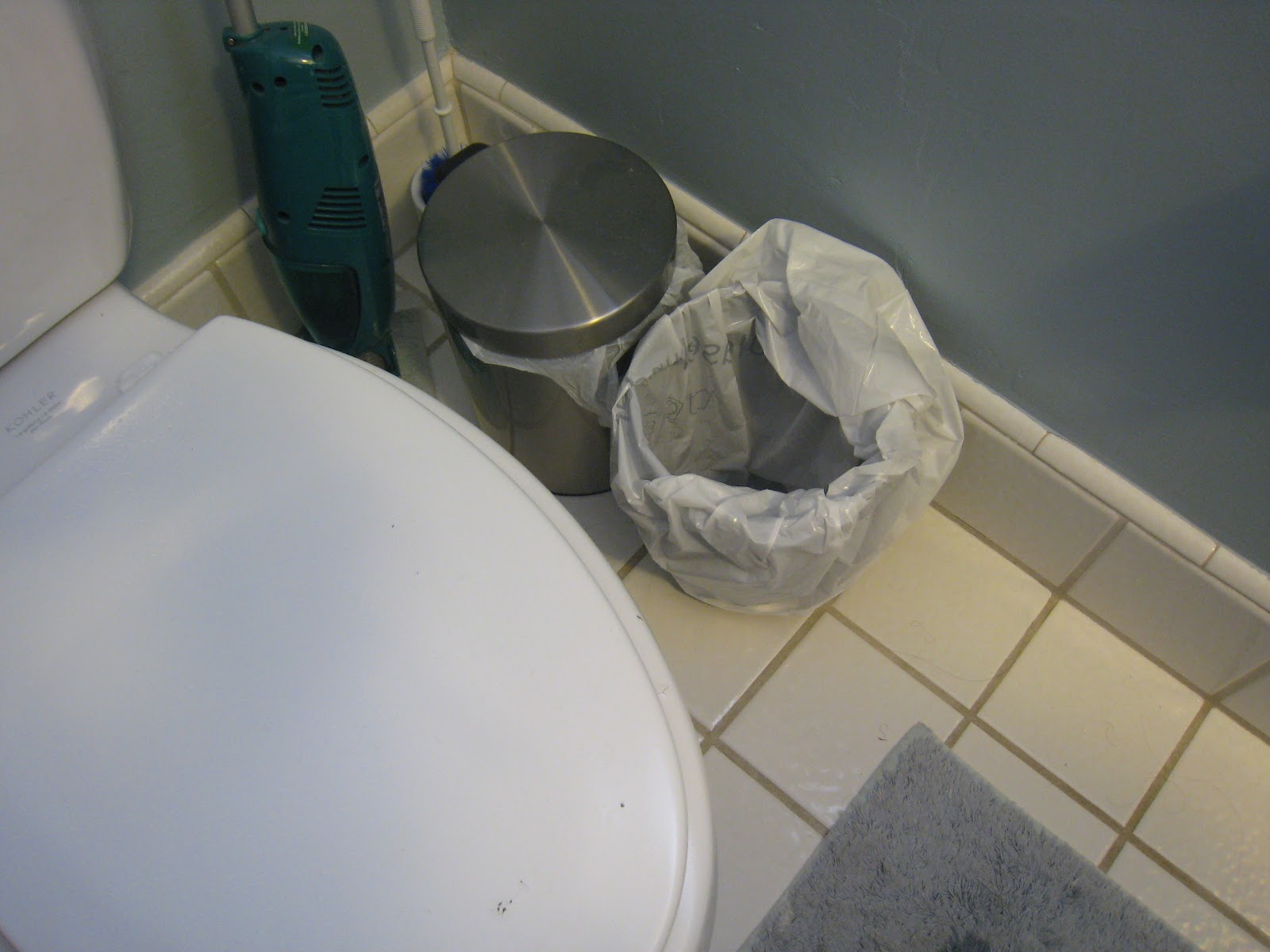 Allison was brushing her hair in the bathroom. Behind her there were two garbage cans. We only need one… Why were there two? When we were taking out the garbage, she took the garbage can from her office, emptied it in the garage, and put it back in the bathroom, right next to the bathroom garbage can, unaware of what she was doing. Then she turned around and started brushing her hair.