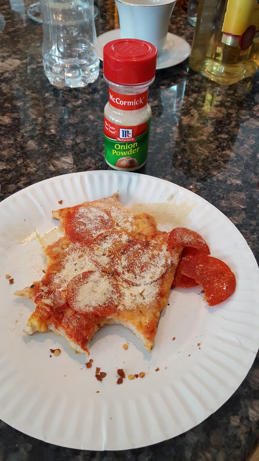 After putting red pepper flakes on it, I put some parmesan cheese on it, but a lot more cheese than I expected came out. That’s when I realized that it was not cheese, but garlic powder.