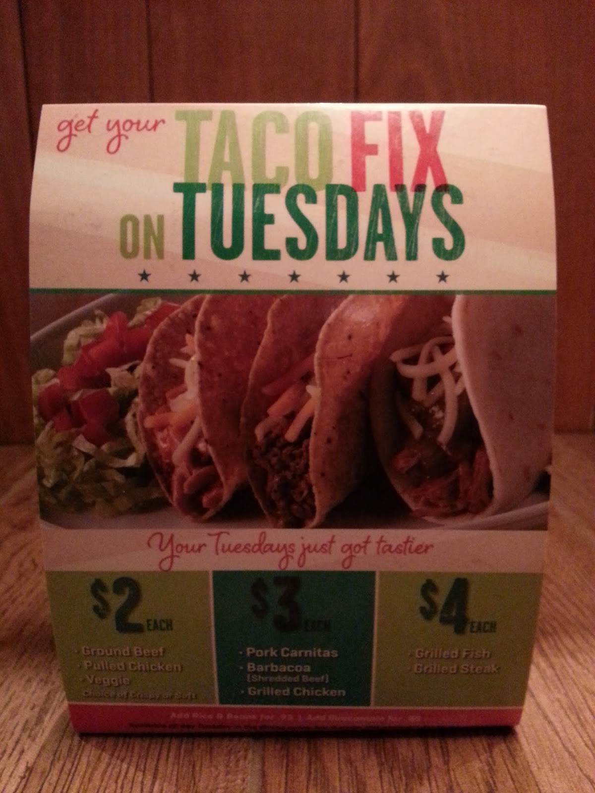Exhausted from a 1,600 mile trip and moving, we went to dinner at a nearby On The Border restaurant. We sat down and saw on the table a “Taco Fix on Tuesdays” pamphlet saying tacos were as low as $2 each on Tuesdays, and we got excited and agreed to come back here on Tuesday to eat lots of tacos (wishing Sharat was with us too). Then we ordered (something else). Then we noticed it was Tuesday…