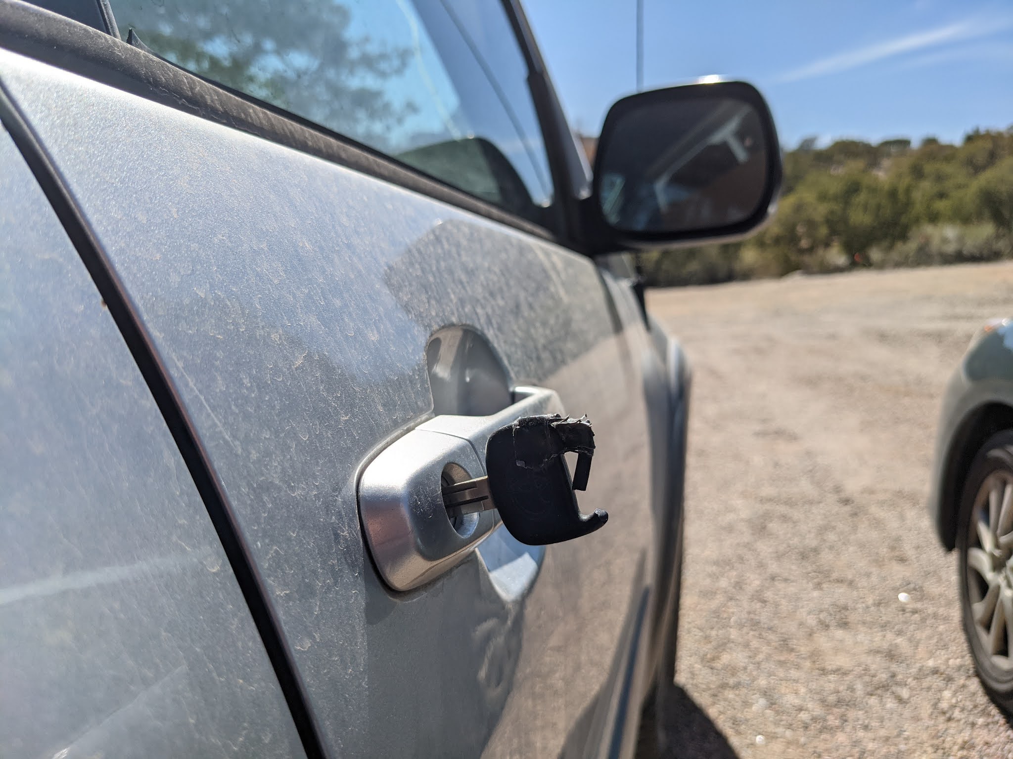 Two days later we took the other car, Allison’s car, out for a long weekend. When we returned from being out of town, I went to put something in my car and there was the key, inserted in the outside of the passenger side door.